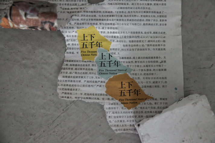 the earth and defies time, transforming into the God of the Soil and Ground.1 Her colossal form, overlooking the viewers, symbolizes a resistance against the hegemonic past. Twelve casts arms appear to emerge from the ground, representing nameless figures reclaiming their place from repression. On the floor, torn and rearranged pages from Five Thousand Years of Chinese Nation, an emblem of authoritarian history, lay scattered.