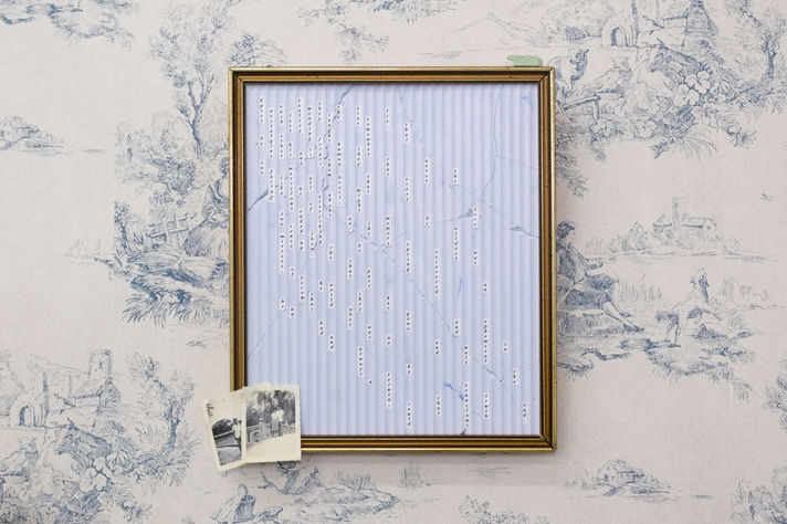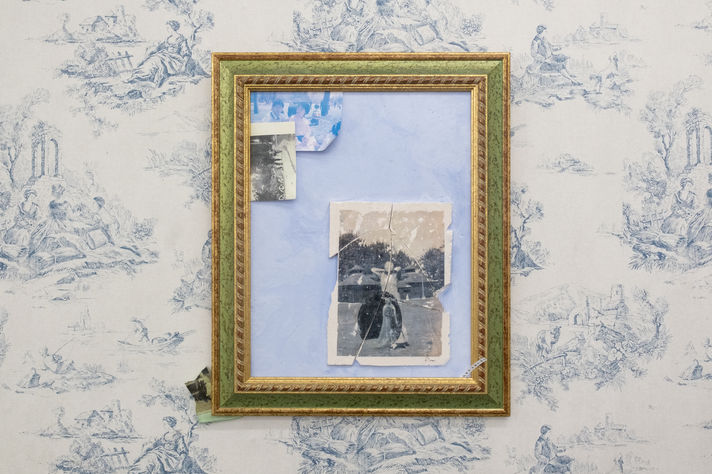 Consisting of a collage of imageries from family albums and lyrical text, The Ceiling of My Bedroom was Painted in Blue (2024) draws upon Dino’s childhood memories in his family home. The series of works primarily made from scattered plaster panels, uses the colour blue as both a visual and emotional current, stretching and enveloping the space. These imageries, either transferred onto the panels or placed alongside them, present love stories spanning three generations of Dino’s family.